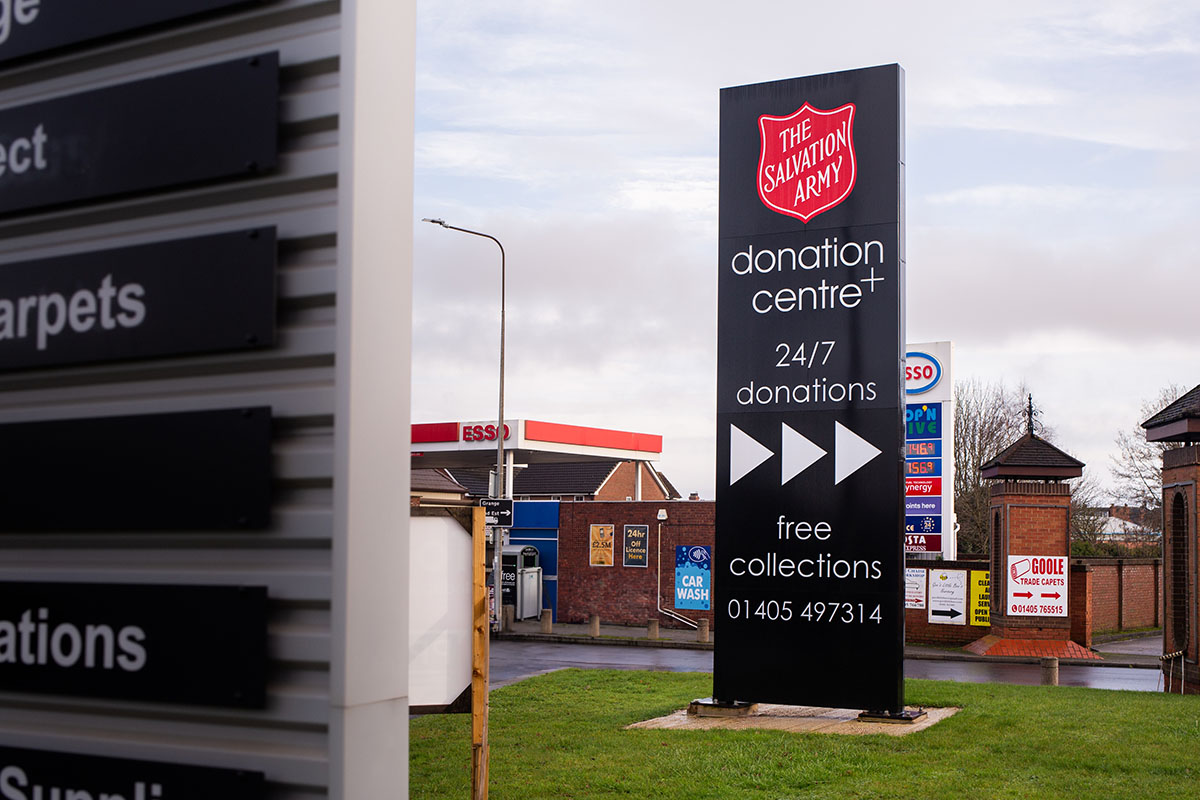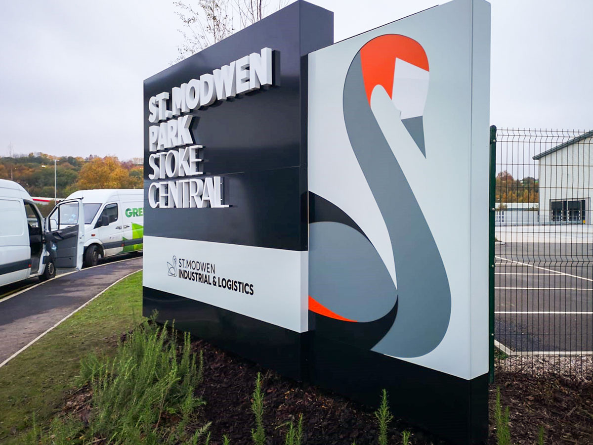 A free-standing signage solution, commonly made from a steelwork frame clad with panels of material to achieve the desired effect, for example, aluminium, wood or steel.